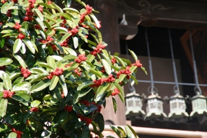 二月堂の横に「クロガネモチ(黒鉄黐)」の赤い実がなっていました。
