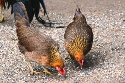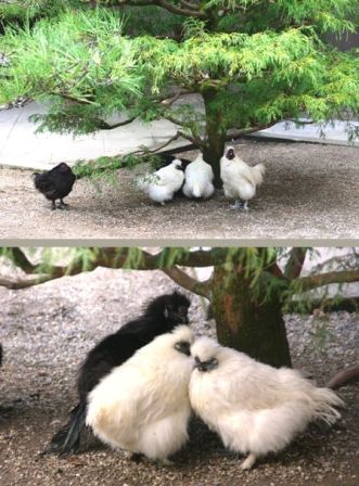 わぁ~、色とりどりの鶏が!種類の違う鶏が寄り添って仲良くしてるのは