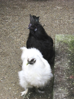 トサカが赤くない黒と白の鶏はめずらしいですね。