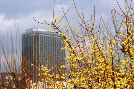 ビルを借景にした蝋梅です。