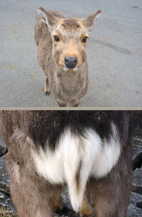 (上)口をもぐもぐさせながらもカメラ目線の鹿さん。(下)別の鹿のしっぽのアップです。