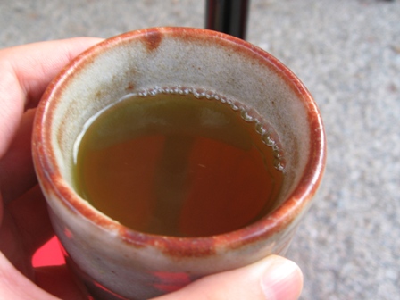 お茶に映っている赤い番傘を写真に撮ってたのです。