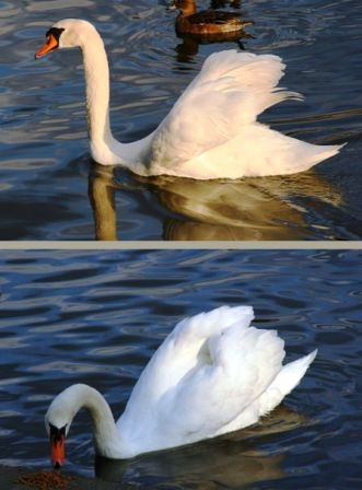 たまに白鷺(コサギ)も見ますが、白鳥はこの深田池でしか