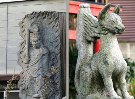 石像と稲荷のキツネさんです。 元興寺塔跡にて