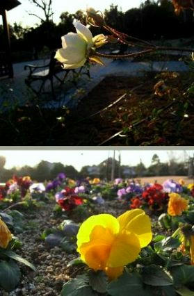 夕日を浴びる白いバラとパンジー