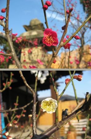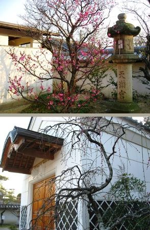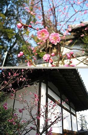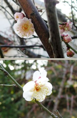 今年は暖冬のようですので早くから梅の花が見られます。白壁の所の梅の木の枝の