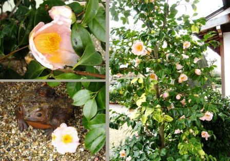 淡いピンクの可愛い椿 満開です。カエルの親子の前にも椿の花が落ちていました。