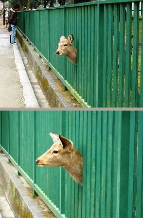 塀から首だけを出してる鹿さん、「剥製か?」と思いきやお茶目な鹿さんだったんですね。