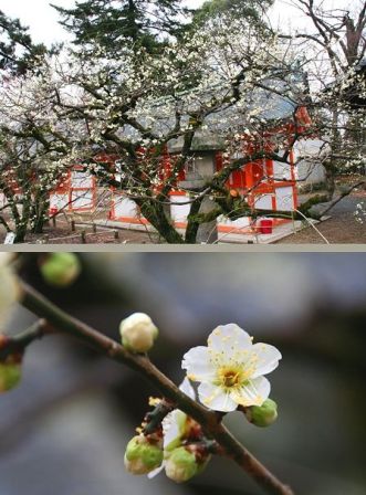 朱塗りのお社を借景にした白梅が何とも綺麗でうっとりしますね。