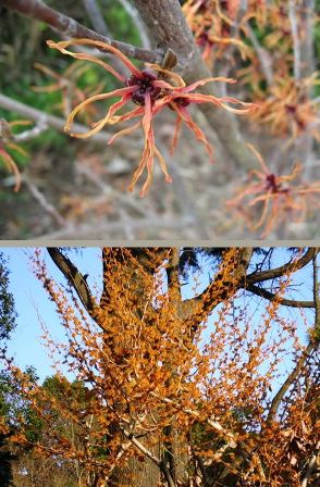 (上)アカバナマンサク (下)別の場所の大きなマンサクの木。満開です。