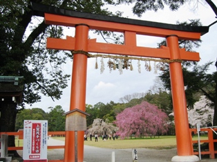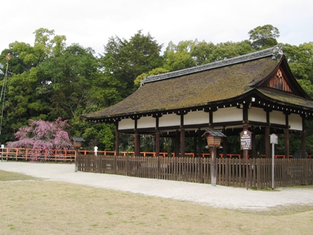 桜はギリギリセーフと言う感じでとりあえず満開だったので、ほっとしました。特にりっぱなしだれ桜が2本あって、とても豪華でした。周りの桜もきれいでしたよ。この日は結婚式を挙げてるカップルが一組いました。京都では、こういう神社で挙式する人達が今でもたくさんおられるんでしょうか。
