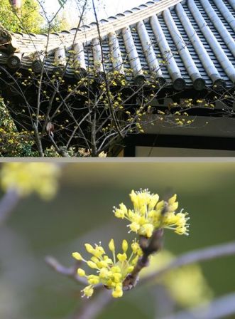 サンシュユです。御影堂と良く合います。