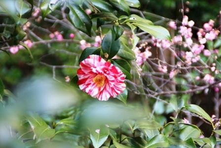ピンクの紅梅を借景に絞りの椿を撮りました。