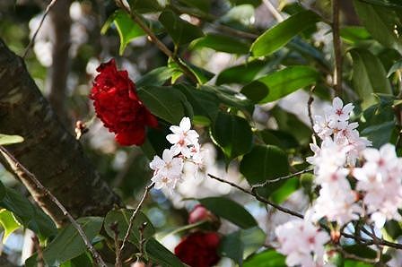 真っ赤な椿と彼岸桜のコラボレーションです。