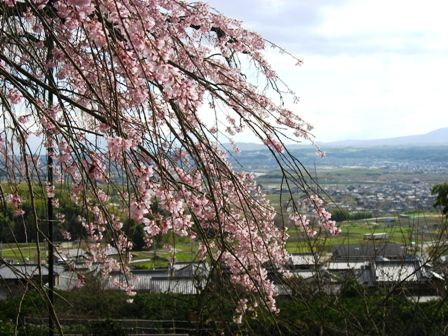 しだれ桜の向こうには、街並みや山が見えます。