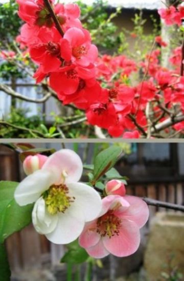 赤い木瓜の花と薄いピンクの木瓜の花です。