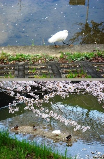 コサギがサッサと歩いています。鴨やアヒルもいます。