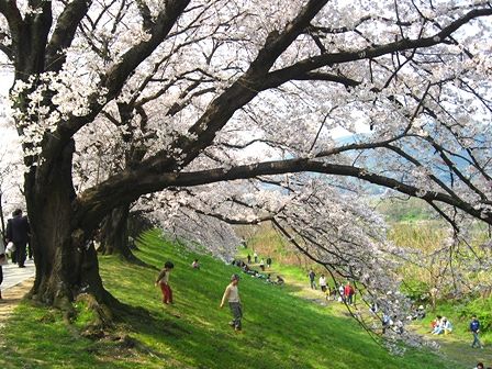 立派な桜の木の下で大勢の人達が休日を楽しんでいました。