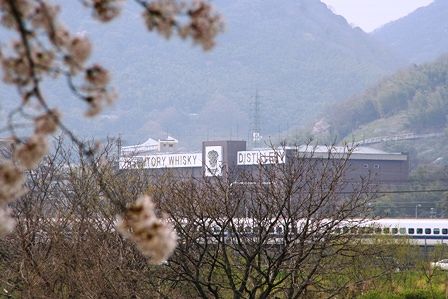 サントリーの工場が見えます。その前を新幹線が走っています。