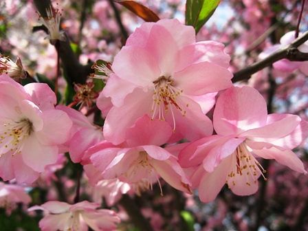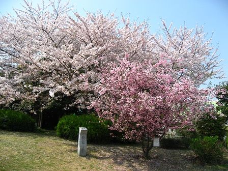 手前は海棠(かいどう)で、その後ろに桜が咲いています。