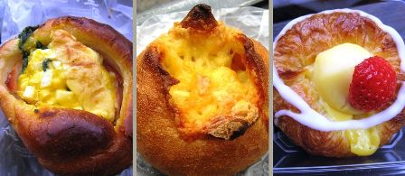 進々堂の卵ほうれん草パン、チーズパン、苺カスタードパンです。
