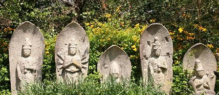 石仏とヤマブキ 左端の観音様がちょっと気に入りました。