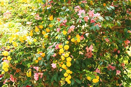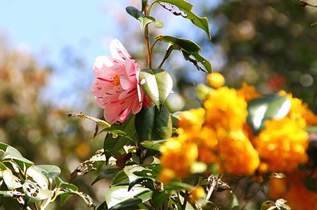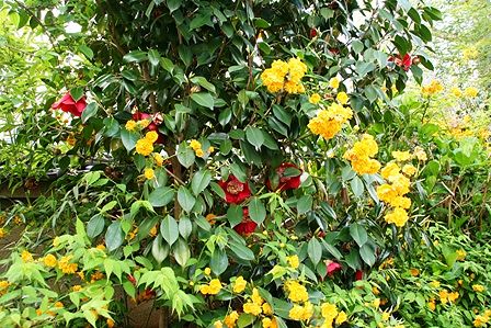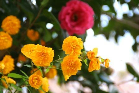 そして、真っ赤な椿とヤマブキ、ピンクの椿とヤマブキ、