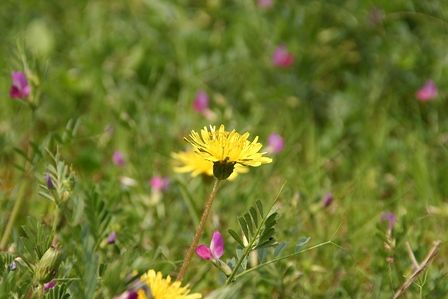 お弁当を食べた所にタンポポが咲いていました。カラスエンドウも可愛いですね。