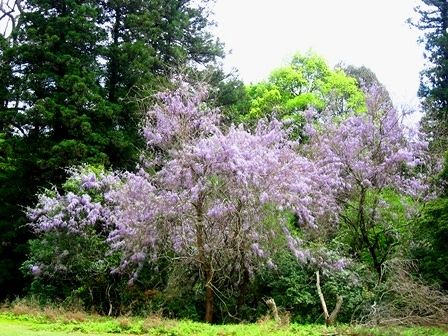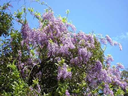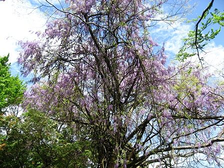 藤の木が倒れて横になった状態で花が咲いているんです。