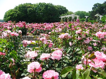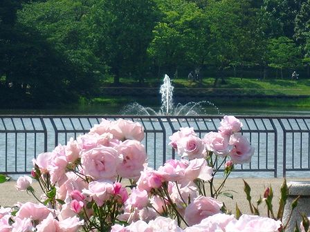 大池の噴水を借景に 「桜貝」と言うバラです。