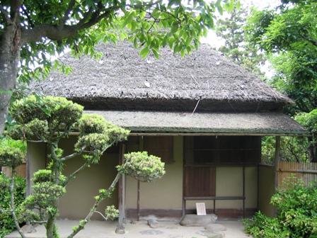 こういう展示はもちろん、撮影禁止。建物くらいしか撮れません。どうしたものかなあと思っていたら、「茶室本日公開」と言う看板が立っていました。博物館の裏にお庭があるようです。それで、覗いてみました。