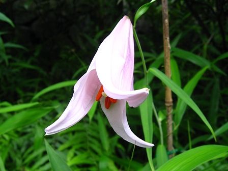 薄いピンクのササユリからちょっと出た赤いおしべが何とも素敵です。