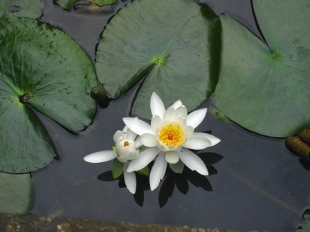 「橋の上から撮った睡蓮」です。純白で葉の形も綺麗ですし