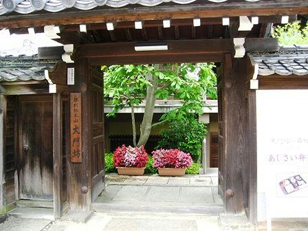 大門坊から見える赤とピンクのお花は何ですか?年代を感じさせる門と意外に合ってますね。