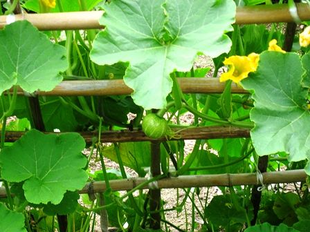 道沿いの畑にかぼちゃの花と実がなっていました。