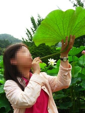 赤い毛氈の敷かれた長いすに腰をかけ、大きな蓮の葉が