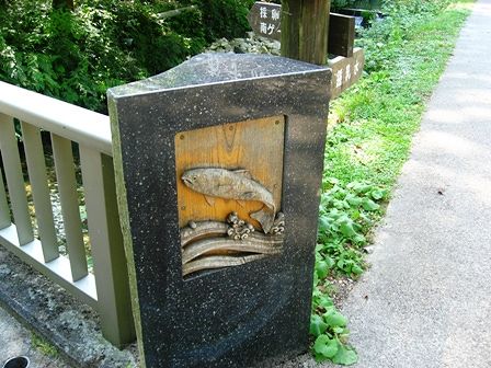 橋には、木彫りのマスが。これ以外にもいろいろなのがありました。