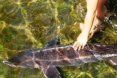 これはチョウザメです。子供が入って魚と遊べる池があるのです。