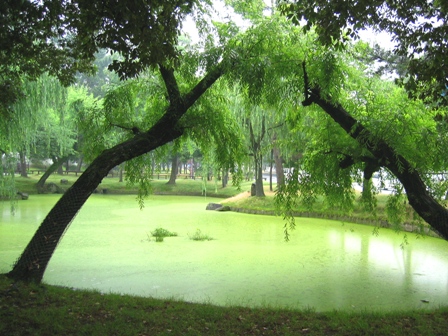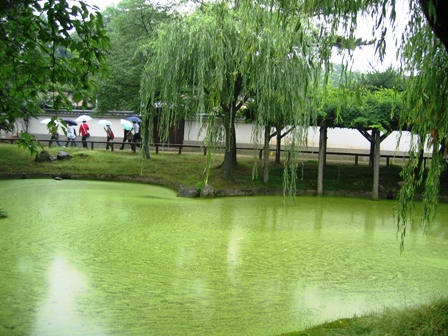 かばんにデジカメを入れていたので、ちょうどそのお店の隣に綺麗な池があったので、撮って見ました。雨の日の奈良公園も良いものですね。緑がとても鮮やかでした。今までこのような池には見向きもしませんでしたが、最近はすぐに目に留まり、写真を撮るようになりました。