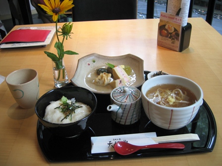 今日は雨だと言うのに、奈良公園の方に用事があったので、しぶしぶ出かけました。用事を済ませた帰り、ふと見ると葛の専門店が見えました。ここの前を何度か通った事がありますが、葛餅とかのお土産屋さんと思っていましたが、お食事も出来るようです。ちょうどお昼だったので、入って見ました。店内はとても素敵で、店員さんの対応も良く、お料理も葛ずくしで、とても美味しかったです。写真のお料理の後にデザートに葛餅が出ました。もうお腹一杯になりました。