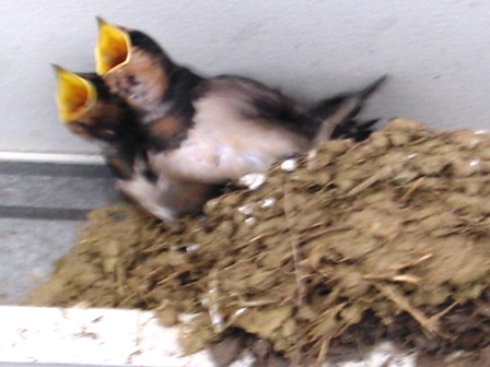 途中、ツバメの巣を見つけました。前から、カメラに収めたいと思っていたのですが、ひなが小さくて巣の中に隠れていてなかなか撮れなかったんですが、さすがにこの時期になると大きくなっていて、素から体半分位出ていました。お母さんツバメがえさをあげる直前、必ず口ばしを全開してひな達は、待ち構えます。その瞬間を撮りました。ぶれていますが、三脚もなく、手持ちで、コンパクトカメラの11倍ズームで撮ったので、まあ仕方ないでしょうと言い訳をしておきます(^_^;)