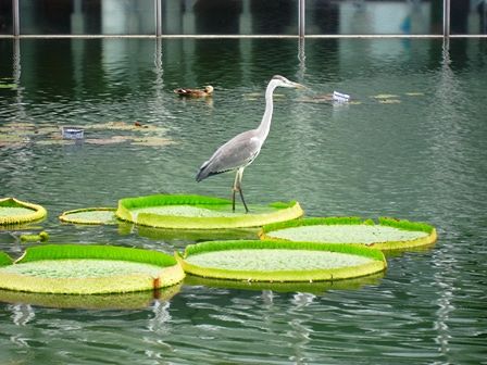 オオオニバスにとまるアオサギ 咲くやこの花館の前の池にて