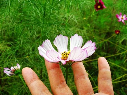 お嬢さんがそっと手を差し伸べたコスモス。そういう発想が私にはないなあと感心しながら見ました。