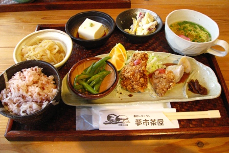 夢市茶屋のお食事、ヘルシーな感じがします。古代米も少しずつ噛み締めながら食べると