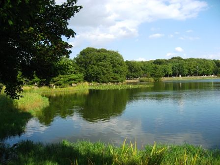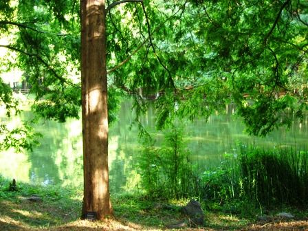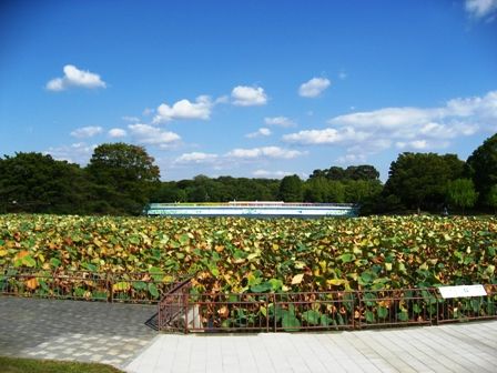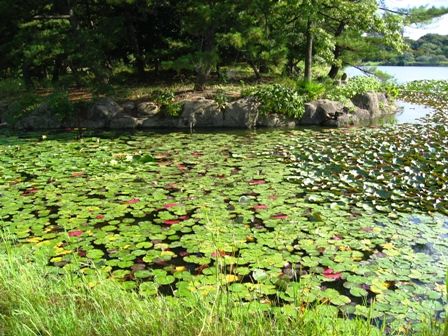 まず目に入るのは、大池です。夏は蓮の花の群生が見られます。