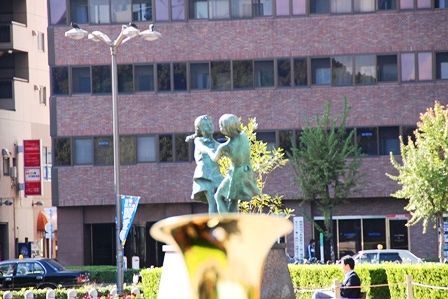 その楽器と少女の銅像を組み合わせたアングルの写真です。