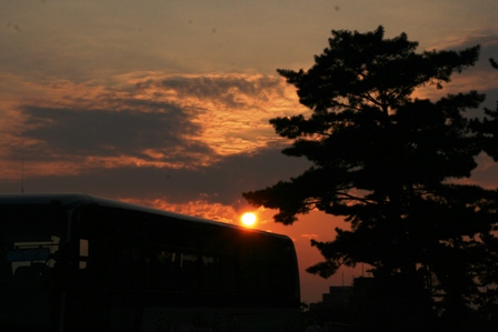 何と、観光バスに沈む夕日なのです。