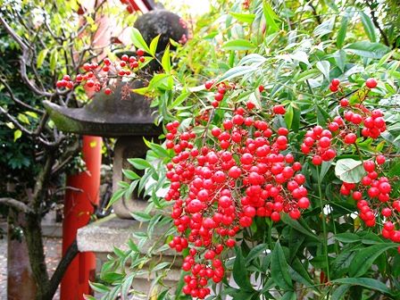 南天の実の赤色が鮮やかです。他にもいろいろ柑橘系の実がなってました。
