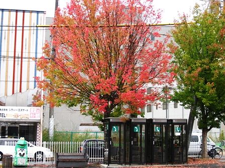 JR奈良駅前の紅葉してる街路樹と公衆電話ボックス