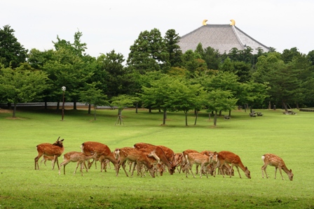 大仏殿と鹿の群れ、そして清々しい緑、とても良い写真ですね。